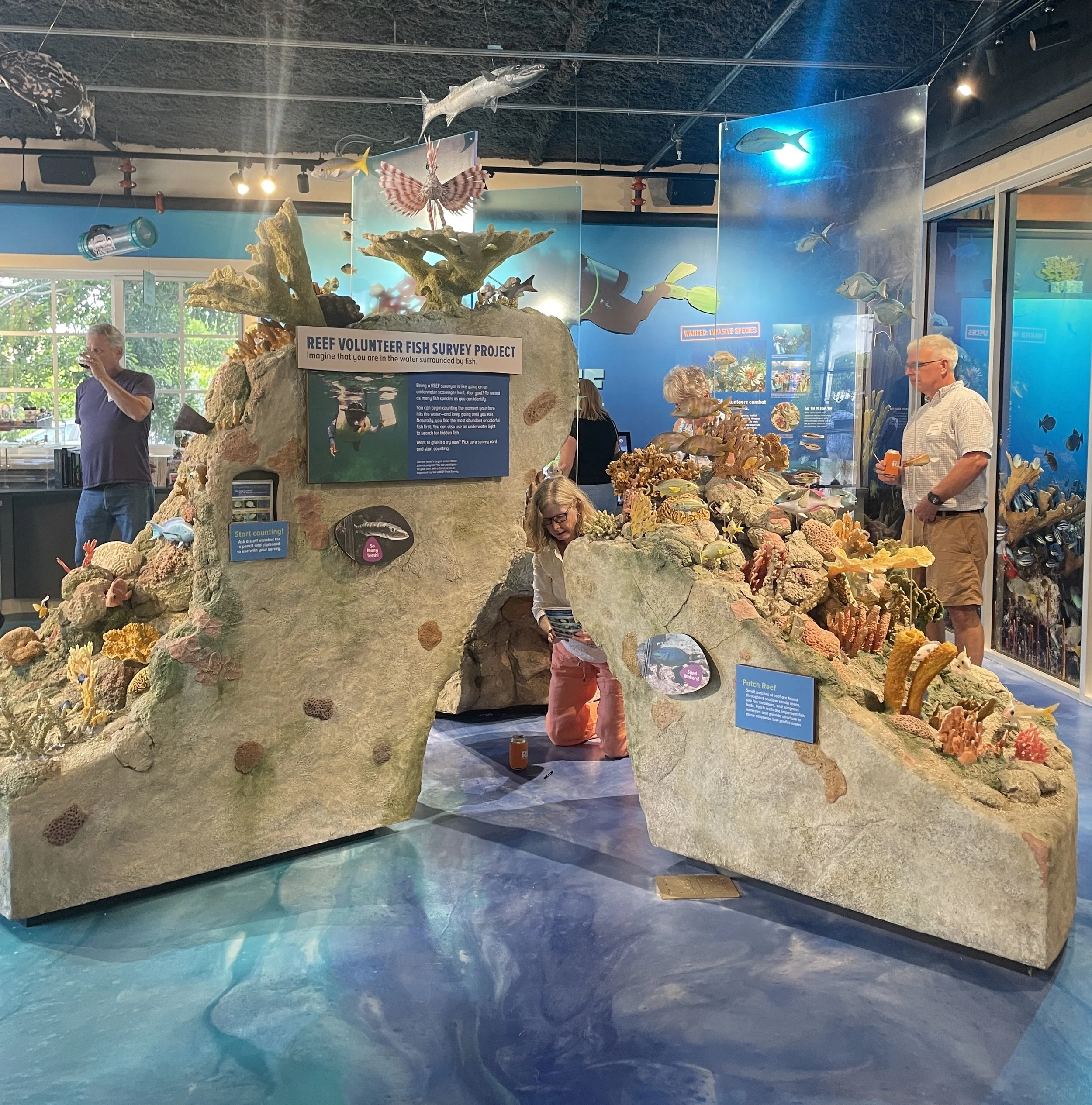 The FRAME team has developed exhibits and experiences that convey the wonders of the ocean habitats, as well as the inspiring work of the REEF organization. The “dry survey” welcomes visitors to locate and identify the over 100 fish species featured throughout the Center!